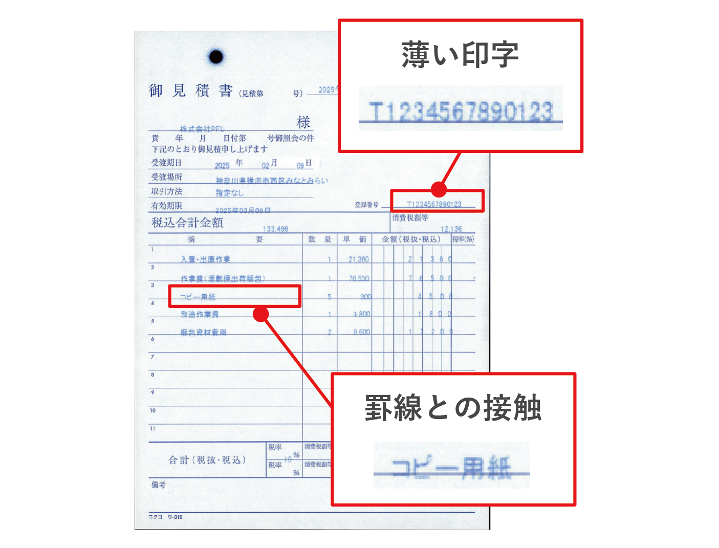 かすれ・傾き・にじみなど、OCRが苦手とする帳票もあります。選ぶ際は、AI-OCRがどこまで多様な文字に対応できるかが重要です。